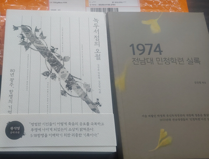 오늘 택배로 책을 받았다. 김상윤 선생이 보내 준 두 권의 책이다. 책 이름은 ‘녹두서점의 오월’과 ‘1974 전남대 민청학련 실록’이다. 김상윤 선생에게 선물한 것이 있는데 답례로 보낸 것 같다.