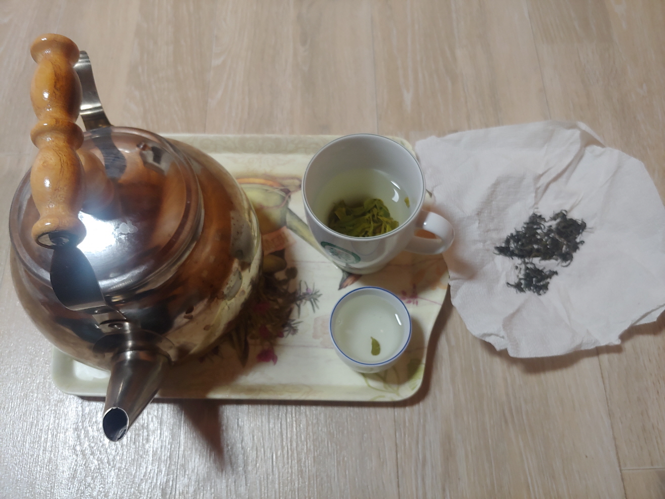 물을 끓인 주전자와 컵과 차를 들고 다락방에 올라왔다. 어느 차인지는 알 수 없다. 아마 이 지역에서 나는 차일 것이다. 차를 조금 컵에 넣고 뜨거운 물을 부었다. 소주잔에 잘 우려 나온 찻물을 부었다. 소주잔이 찻잔이 되는 순간이다. 새벽녘 갈증이 풀렸다. 뜨거운 물이 목구멍을 타고 들어가자 속이 "짜르르"하는 것 같다.