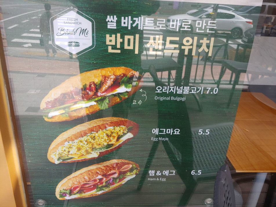 7천원짜리 반미 이름은 오리지널불고기라고 되어 있다. 이를 불고기반미라고 해야 할 것이다. 그렇다면 반미란 무엇일까? 커피점 창에는 쌀 바케트로 바로 만든 반미 샌드위치라고 써 있다. 칼국수와 마찬가지로 쌀로 빵을 만든 것이다. 베트트남에서는 쌀을 이모작 가능하기 때문에 가능한 일일 것이다. 반미 맛은 어떨까?