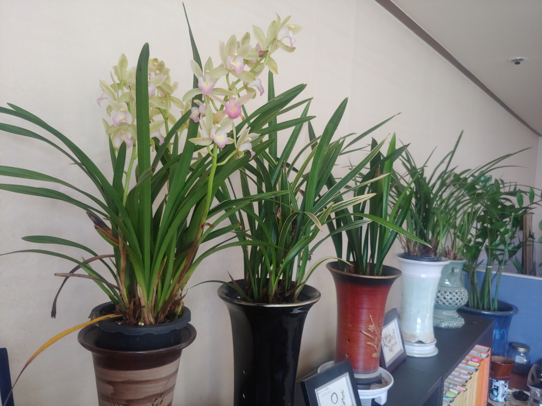 백운이라는 이름의 난꽃이 절정을 맞았다. 세 갈래로 꽃대가 형성되어서 생전 처음 보는 화사한 꽃을 선보이고 있다. 난이 여섯 개이다 보니 줌모임 할 때 배경으로 그만이다. 의자 뒤에 책장 위에 있다. 경전과 난이 잘 어울려서 최상의 배경화면을 만든다.