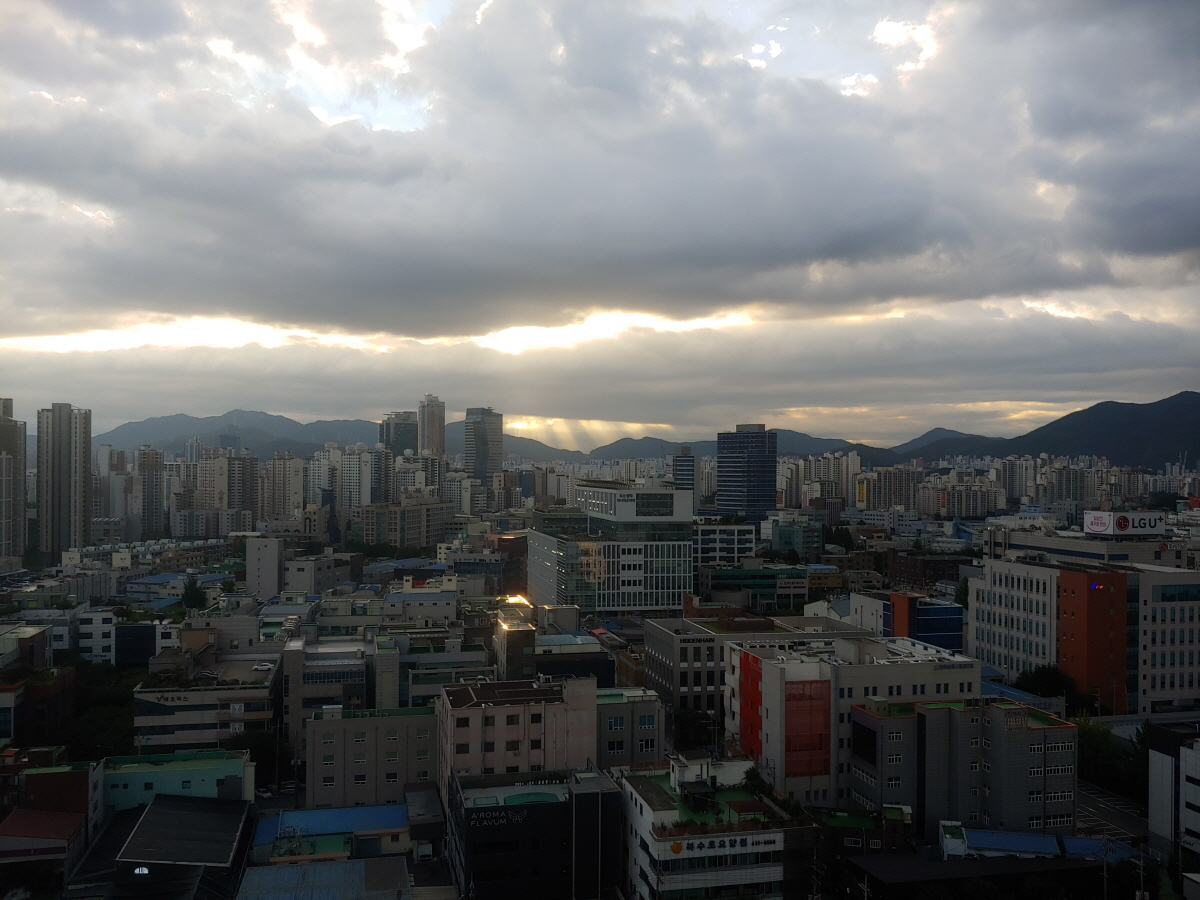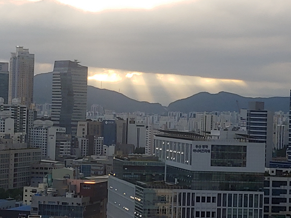 일터에 도착해서 18층 꼭대기층으로 갔다. 평촌방향 동쪽 하늘을 촬영하기 위해서이다. 해는 구름에 가려 있다. 진회색 구름사이로 햇살이 내비친다. 마치 커튼같다. 영화의 한장면을 연상케 한다.