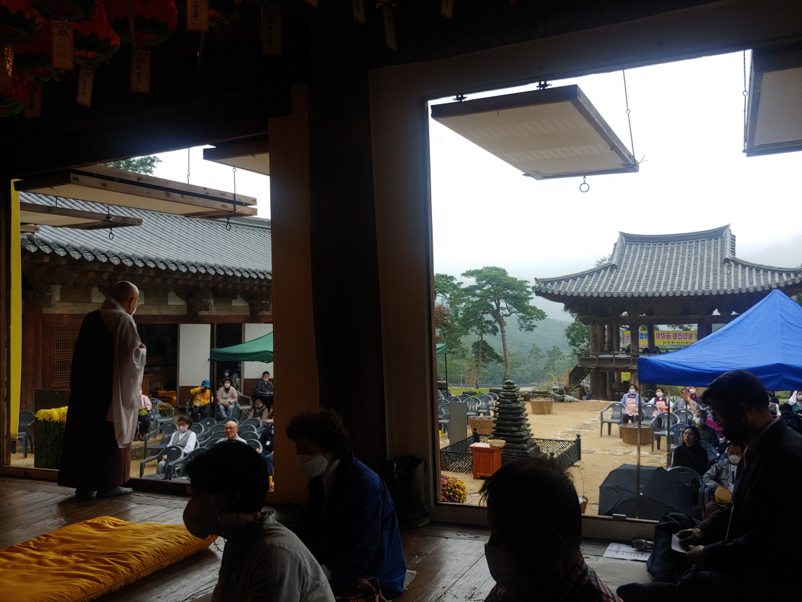 오전 10시 반부터 법회가 시작 되었다. 범종루에서 쪼그려 앉아 있었는데 37기 동기이자 봉사대로 활동하고 있는 김동수 선생이 대웅전 법당으로 안내 했다. 비가 간간히 내리는 가운데 사람들은 야외 간이 의자에 앉아 있었다.
