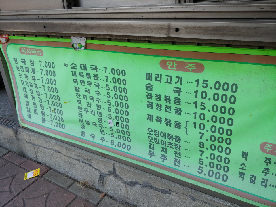 오늘 가기로 한 곳은 명학역 먹거리골목에 있는 순대집이다. 5평도 안되는 작고 허름한 집이다. 간판에는 ‘장터순대국’이라고 되어 있다. 국밥전문집인 것이다. 그러나 메뉴판을 보면 실로 다양하다. 청국장, 된장찌게, 순두부, 김치찌개, 내장탕, 육계장, 설렁탕, 갈비탕, 뚝불 등 매우 다양하다. 정말 이 많은 메뉴를 다 하는 것일까?
