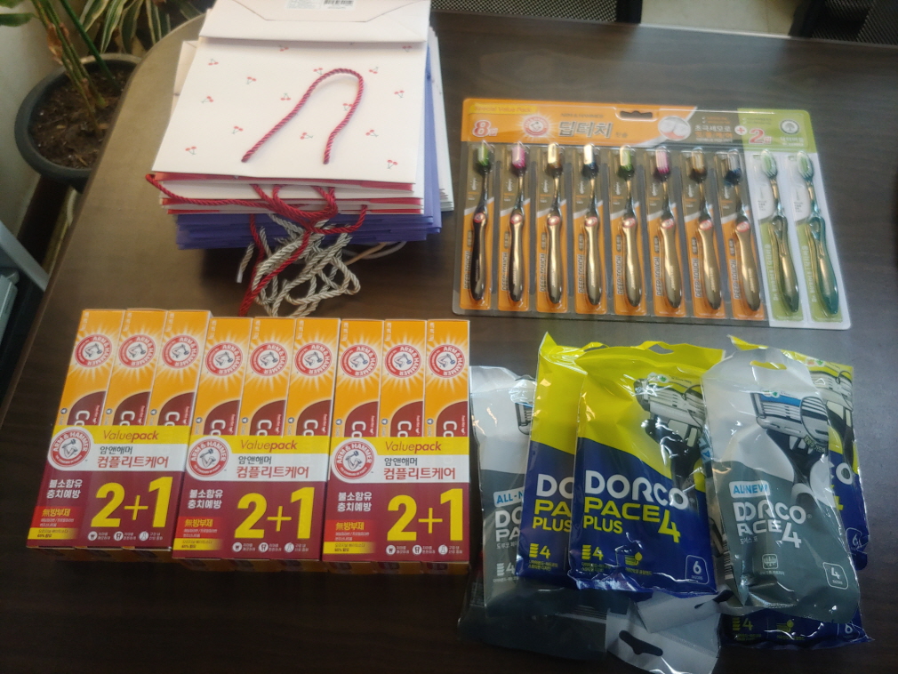 면도기는 네 개들이 한세트이다. 면도기와 함께 치약 한개, 치솔 한개, 비누 한개를 한묶음으로 했다. 열 명분을 사다 보니 모두 14만 5천원 들었다. 가사보시금보다 훨씬 더 많이 든 것이다.