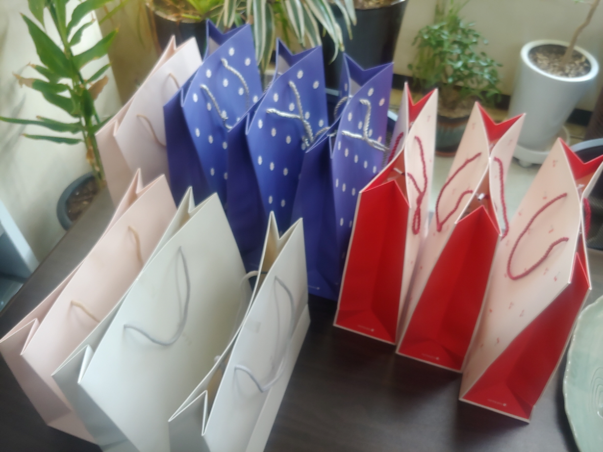 필수품은 준비 되었다. 다음은 담을 것이 필요했다. 작은 쇼핑백을 사야 했다. 종류 별로 샀다. 사놓고 보니 컬러풀하다. 획일적인 것 보다 낫다.