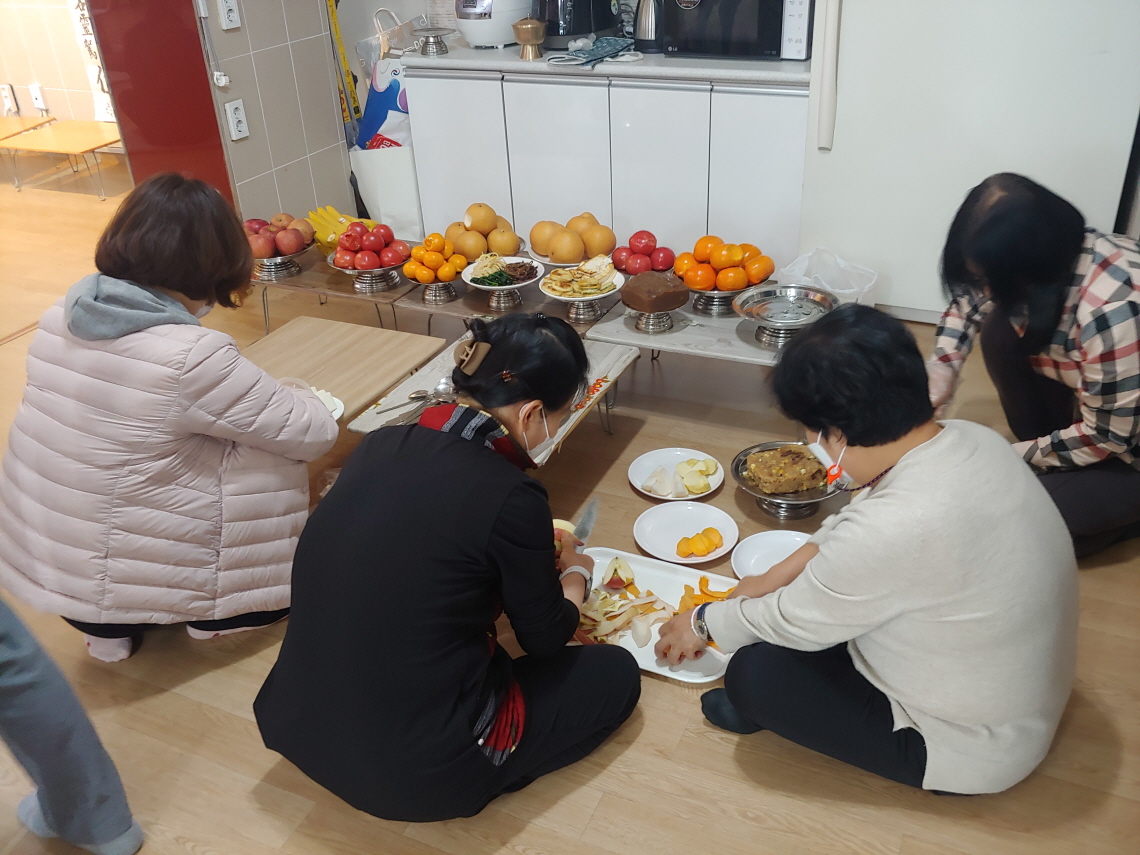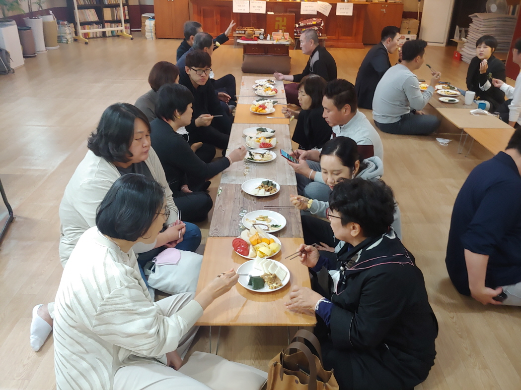 천도재가 모두 끝났다. 다음은 음식을 나누어 먹는 시간이다. 천도재에 참석한 불자들은 법당에 앉아 떡과 과일, 그리고 음식을 먹었다. 일종의 음복을 한 것이다.
