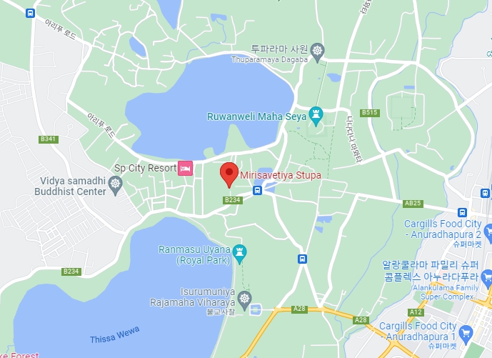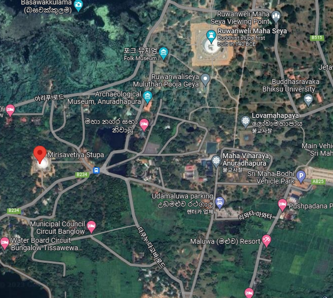 미리사베티야는 어디에 있을까? 구글지도를 찾아 보았다. 보리수가 있는 곳에서 서쪽으로 불과 700-800미터 거리밖에 안된다. 이는 아누라다푸라 신성도시 구역이 거의 10키로에 달하는데 이에 비하면 이웃 마을에 있는 것이나 다름없다.