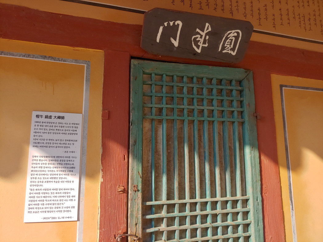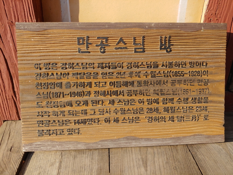 만공방에도 들어가 보았다. 짧은 시간이지만 좌선을 해 보았다. 그리고 누워 보았다. 이 좁은 방에서 어떻게 세 명이 잘 수 있었을까? 안내문을 보니 수월스님 28세, 혜월스님 23세, 만공스님 14세때 였다고 한다.