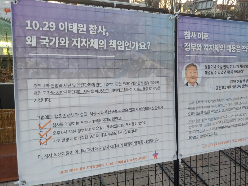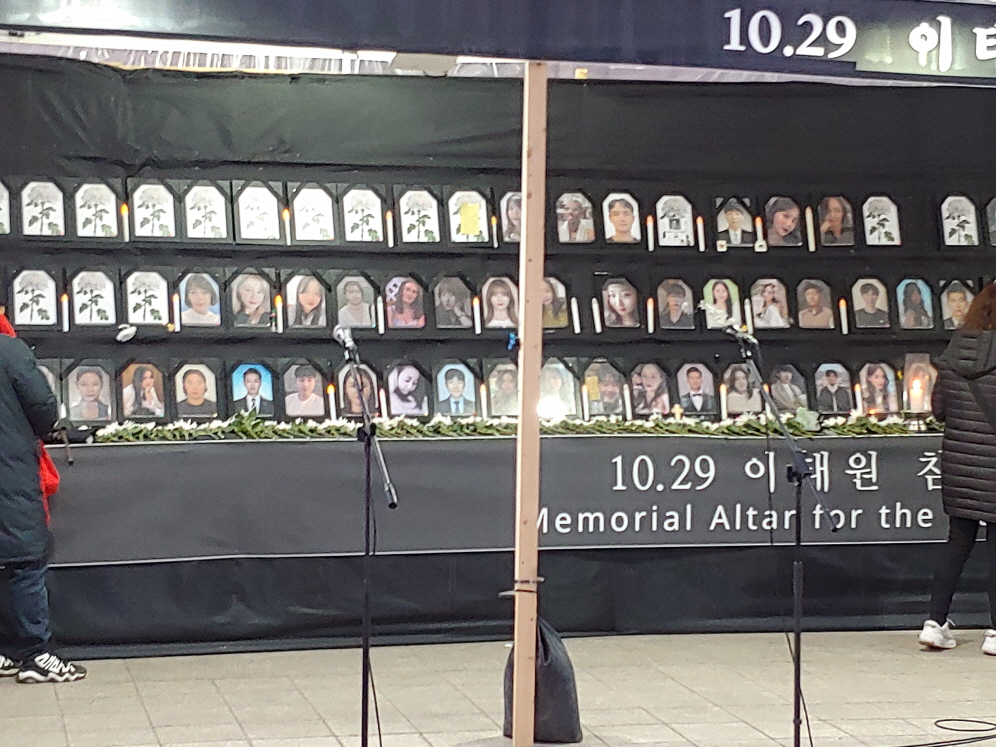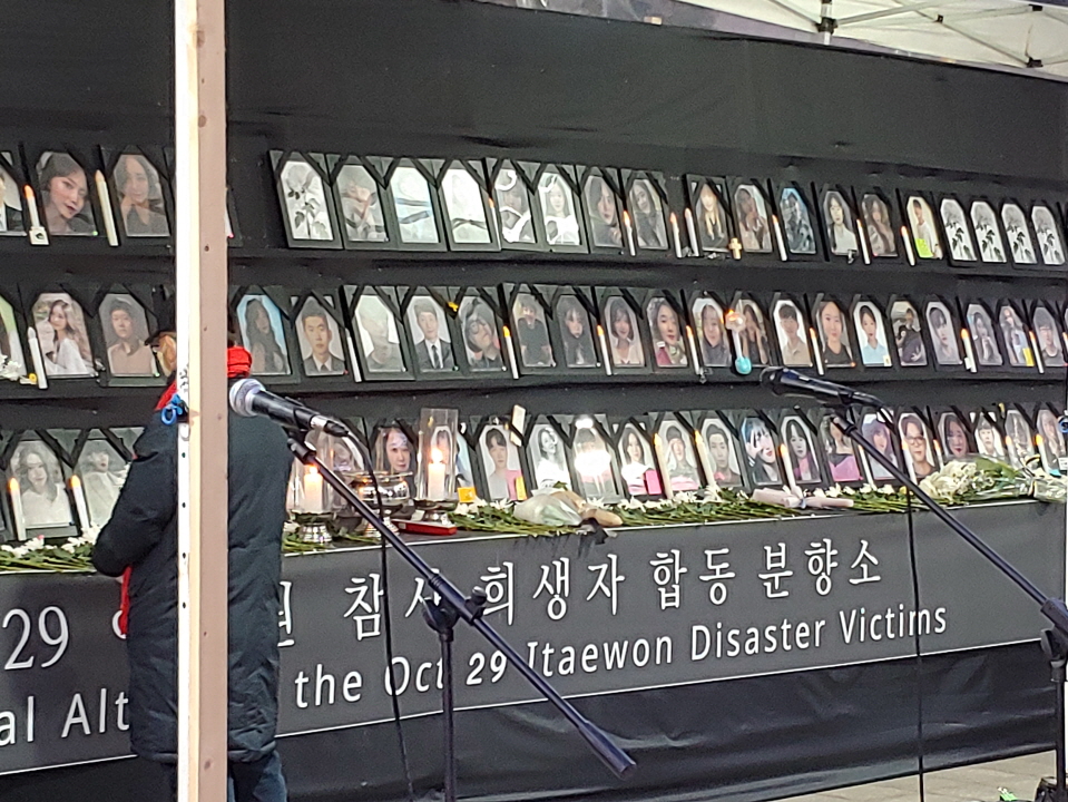 6시 20분 시청분향소에 도착했다. 10.29 참사가 일어 났을 때 분향소가 설치되긴 했었는데 영정 없는 분향소였다. 그때 굥은 매일 꽃들에게 분향 했다. 그런데 이번에는 영정이 있는 것이었다. 유가족들이 정부의 반대에도 불구하고 설치해 놓은 것이다.