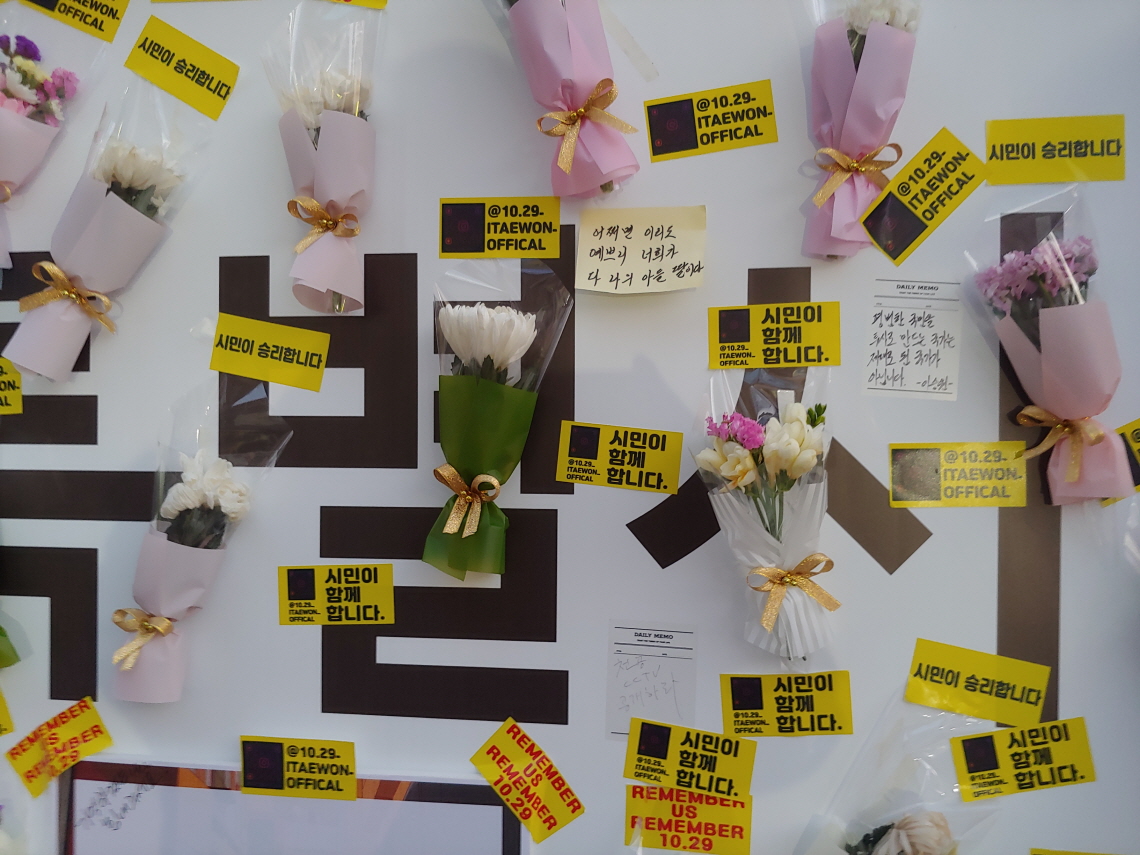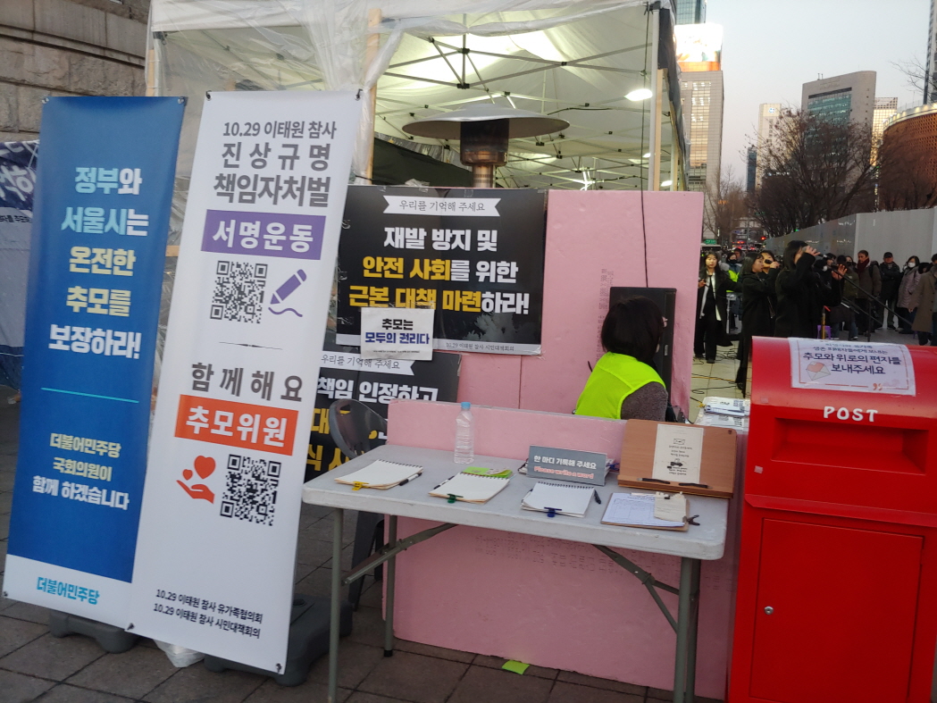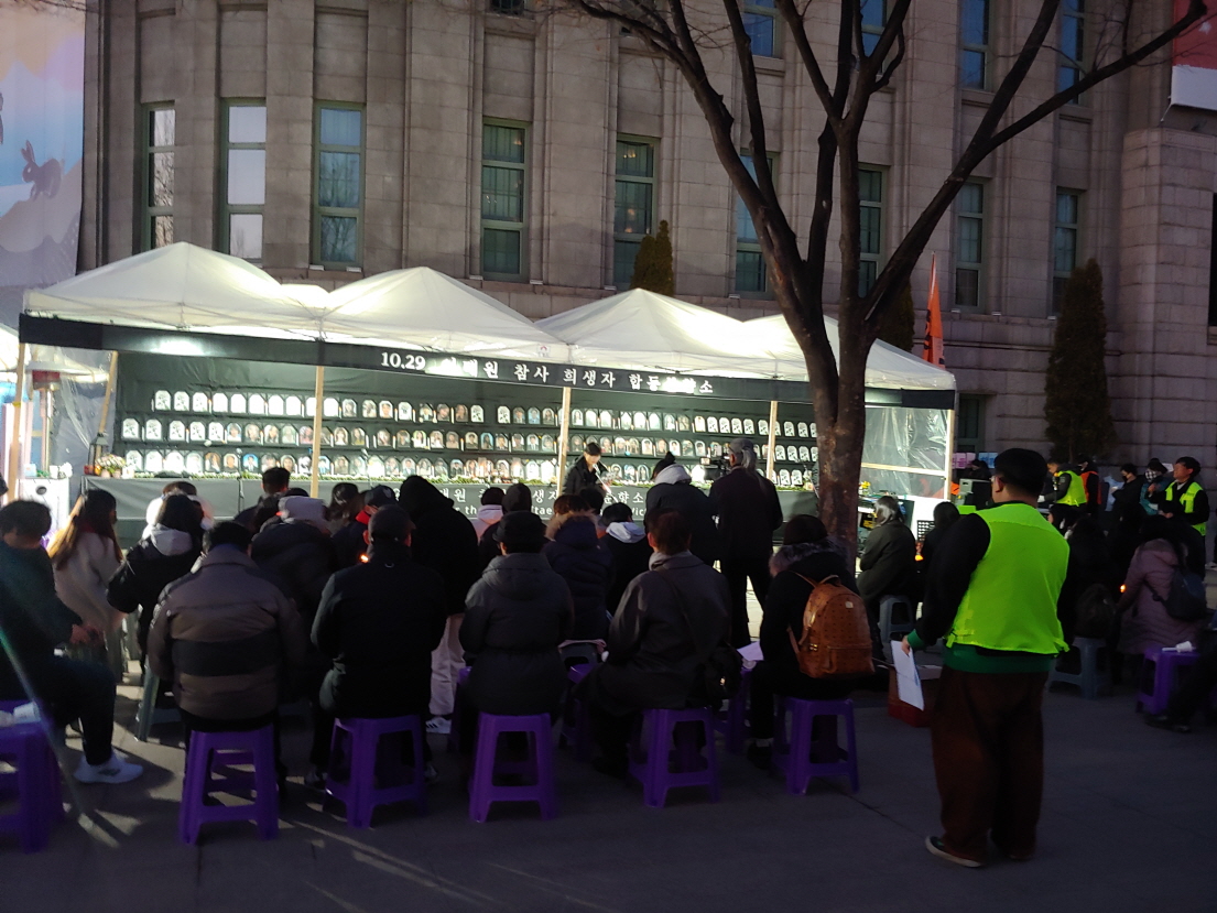 도착한지 한시간 되었을 때 귀가하고자 했다. 그때 불현듯 시청 분향소가 생각 났다. 10.29 이태원참사 분향소가 시청 청사 앞에 설치 되었다는 소식을 들었기 때문이다. 더구나 며칠전 카톡방에서는 분향소를 지키자는 다급한 공지가 뜨기도 했다. 서울시청에서 분향소를 강제철거하려 한다는 것이었다.