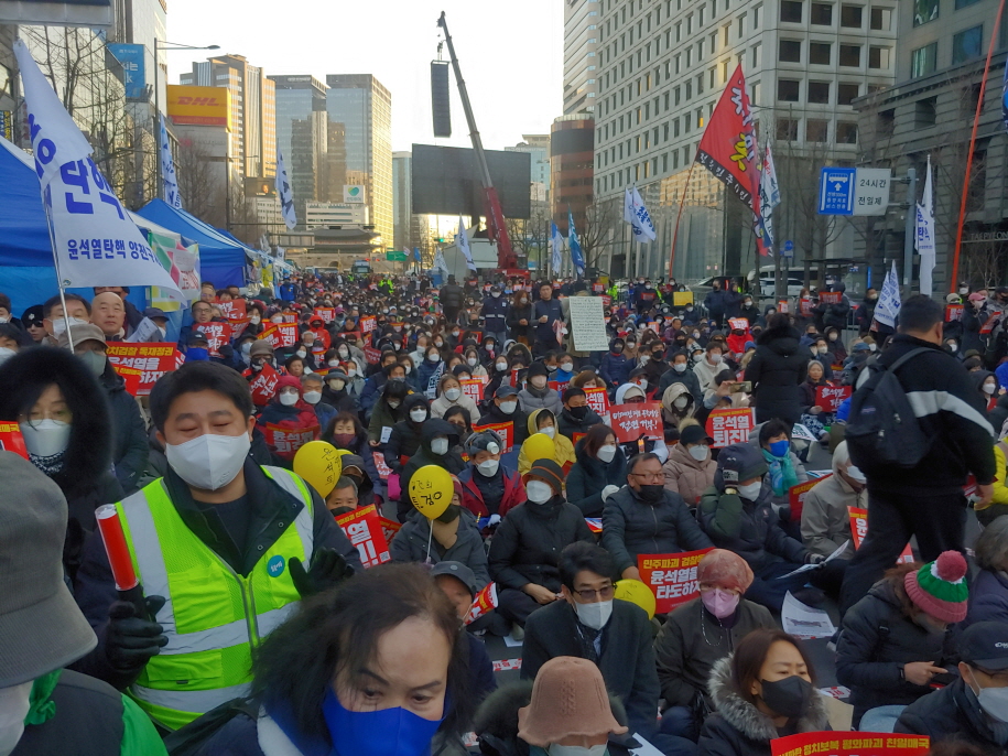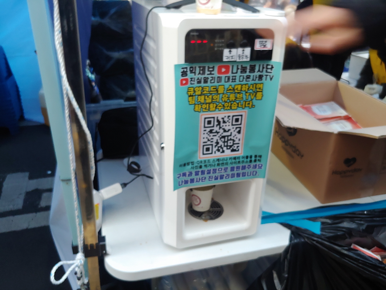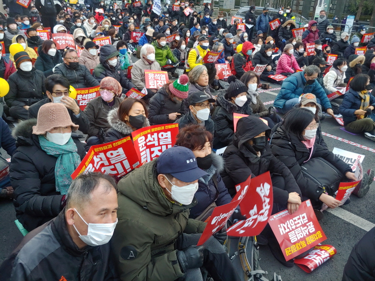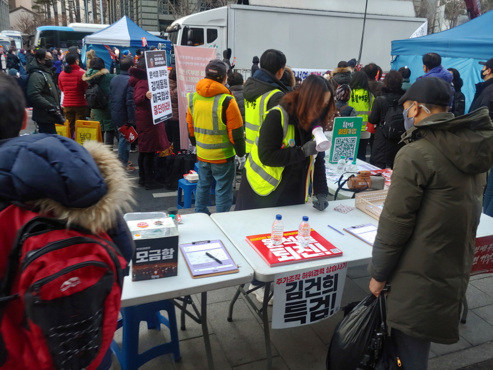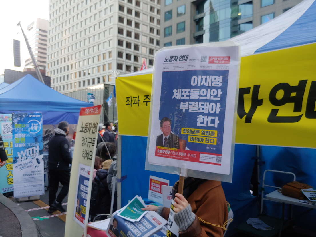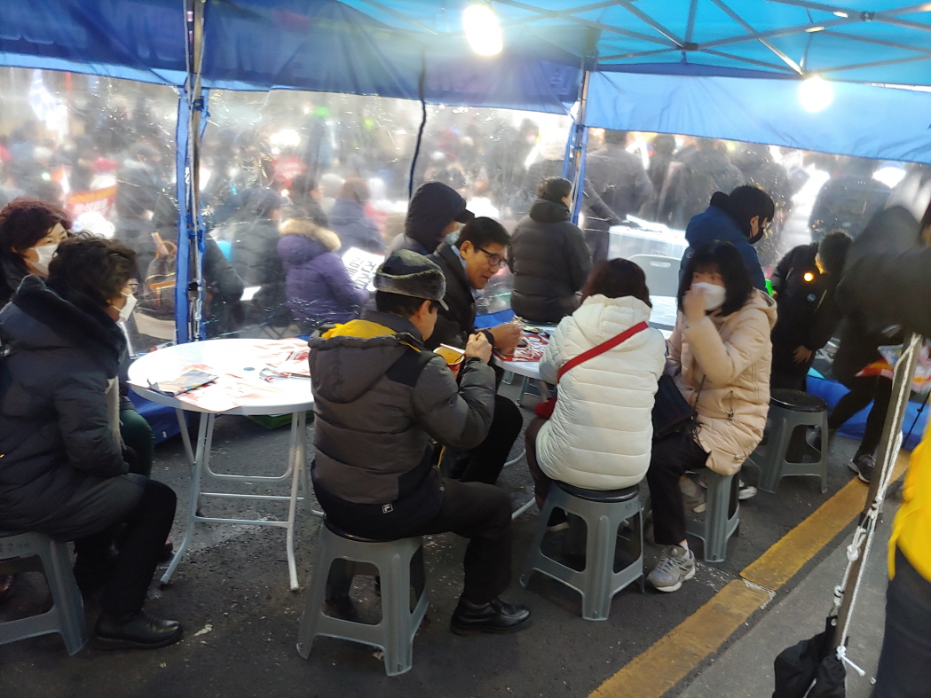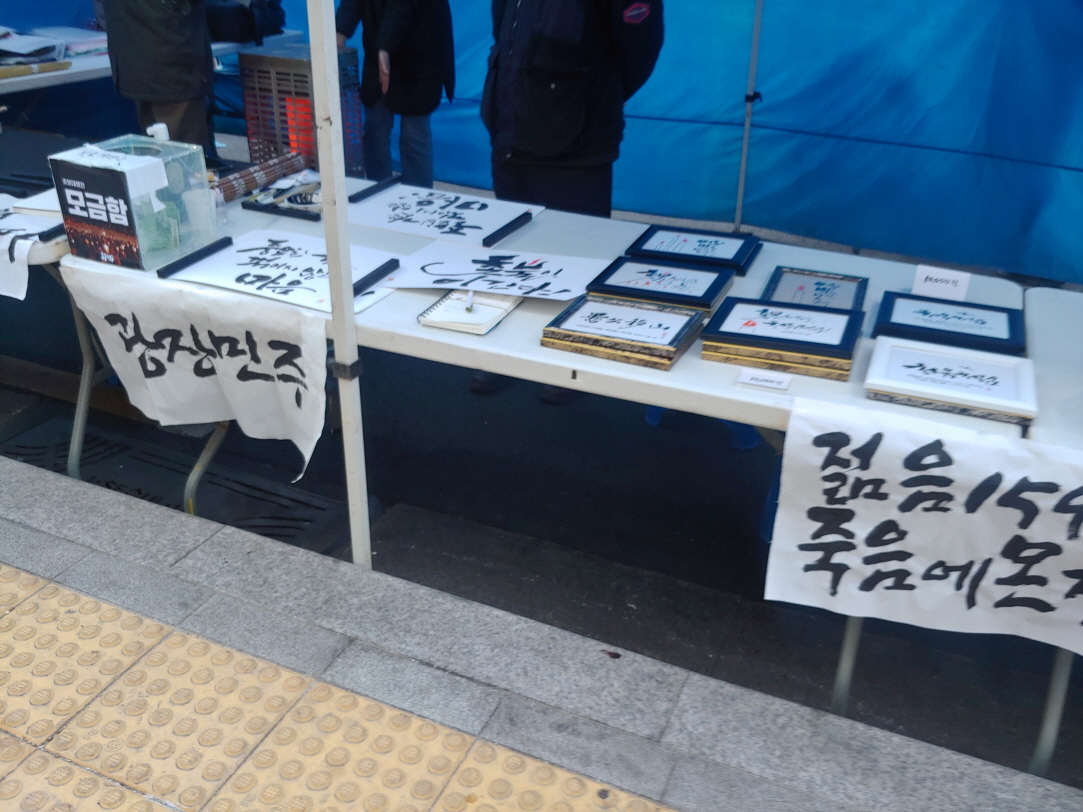늘 그렇듯이 대로의 반은 사람들로 가득하다. 추운 날씨에도 불구하고 단단히 껴입고 나와 앉아 있다. 인도를 따라 갖가지 부스가 열지어 있다. "윤석열퇴진 100만 범국민선언" 서명도 받고 있다.