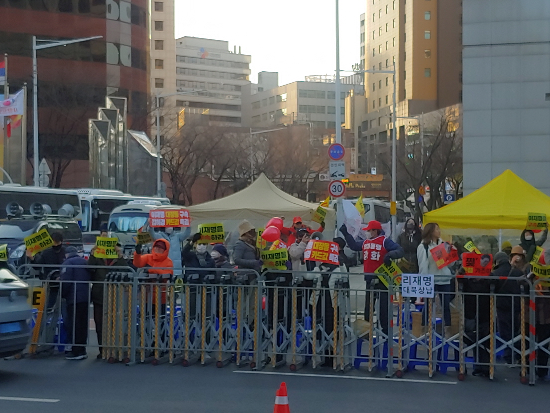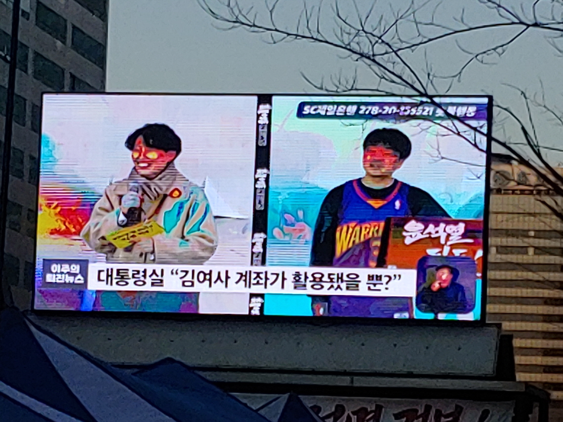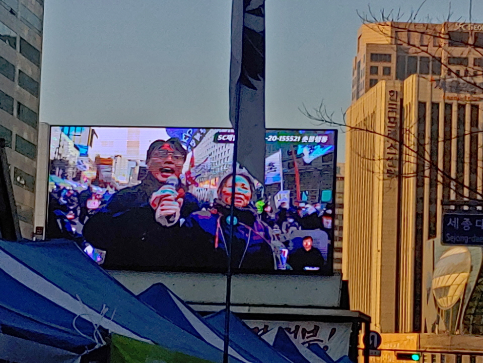 그들은 100명도 되지 않는다. 그럼에도 고성능 확성기로 촛불대행진을 방해한다. 그들은 끊임없이 "이재명 구속"을 와친다. 마치 고장난 녹음기를 틀어 놓은 것 같다. 대형 전광판에는 "재명아! 깜방 가즈아~"라는 문구가 고정되어 있다.
