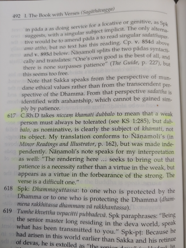 “C.Rh.D takes niccaṃ khamati dubbalo to mean that a weak person must always be tolerated (see KS 1:285), but dubbalo, as nominative, is clearly the subject of khamati, not its object. My translation conforms to ñāṇamoli's (in Minor Readings and Illustrator, p. 162), but was made'independently. ñāṇamoli' s note speaks for my interpretation as well: "The rendering here ... seeks to bring out that patience is a necessity rather than a virtue in the weak, but appears as a virtue in the forbearance of the strong. The verse is a difficult one." (617번 각주, 빅쿠보디, CDB 492쪽)