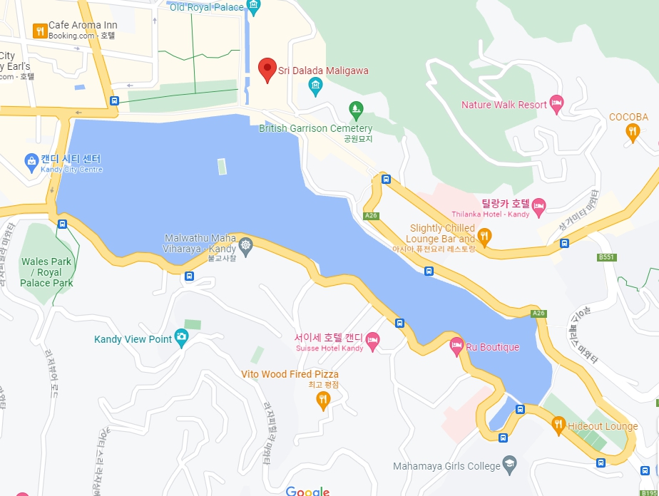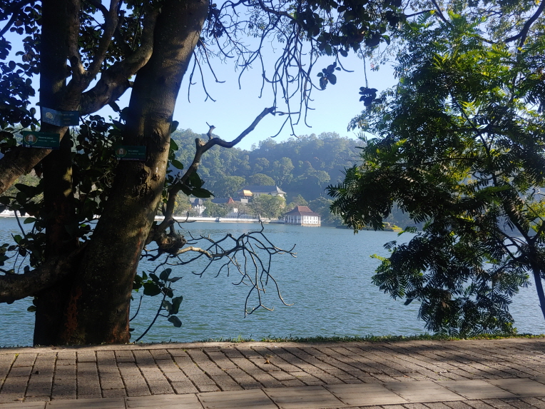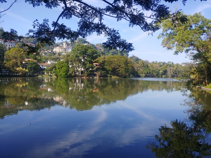 구글지도검색을 해보니 캔디호(Kandy Lake)이다. 동서로 비스듬히 있는데 가로 1.2키로에 세로는 서쪽에 폭이 넓은 곳은 3백미터가량 되고 폭이 좁은 동쪽은 백미터가량된다.
