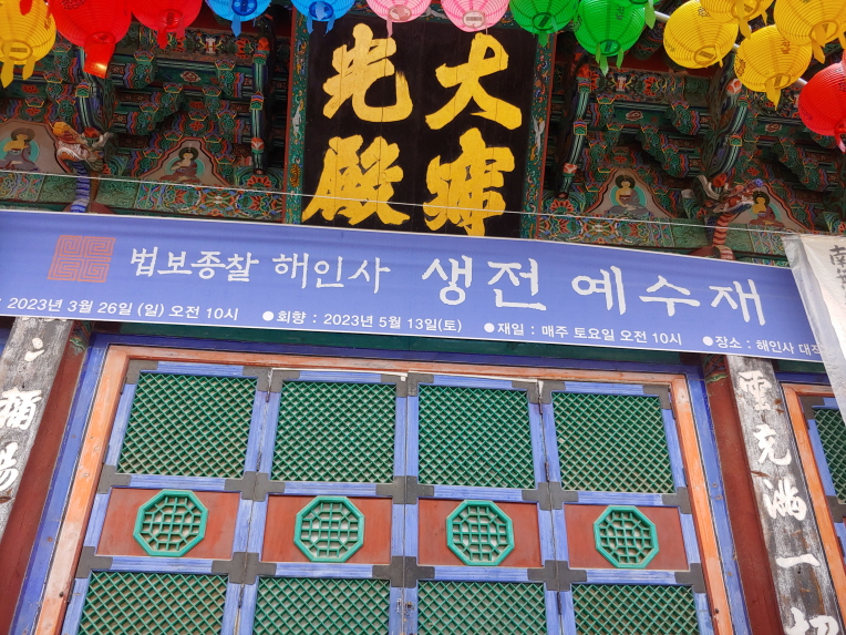 해인사 주법당에 현수막이 펼쳐졌다. 생전예수재 현수막이다. “법보종찰 생전예수재”라는 현수막이다. 법보종찰이라는 말과 생전예수재라는 말이 잘 어울리지 않는다.