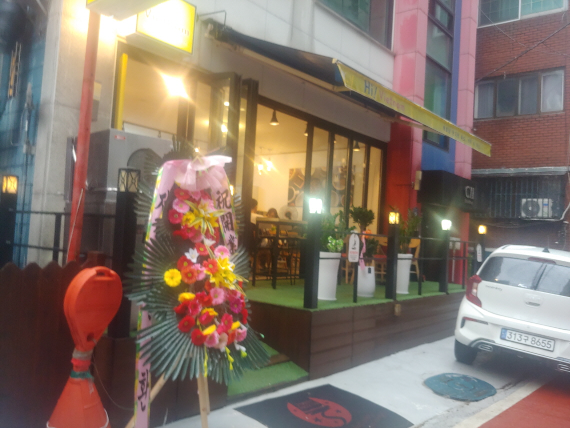 쌀국수집은 오픈한지 얼마되지 않은 것 같다. 개업을 축하하는 화환이 서 있다. 식당 명칭은 ‘Hi! Vietnam’이다. 메뉴로는 쌀국수, 커피, 주스가 있다. 음식점과 커피점을 겸하는 것 같다.
