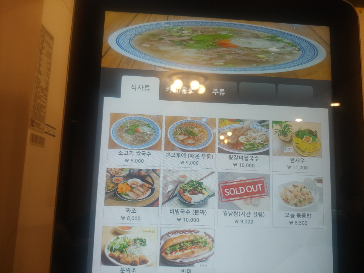 주문은 화면터치 방식으로 한다. 고속도로 휴게소에서 볼 수 있는 것이다. 가격은 얼마나 할까? 소고기쌀국수가 8천원이다. 충분히 예상한 것이다. ‘문보후에’라 하여 매운 우동은 9천원이다. 왕갈비쌀국수는 만원이다. 이 밖에 ‘짜조’라는 메뉴가 있다. 아마 만두처럼 베트남 보조 음식같다. ‘분짜’라는 이름의 비빔국수는 만원이다. 또한 반미 샌드위치도 있다.