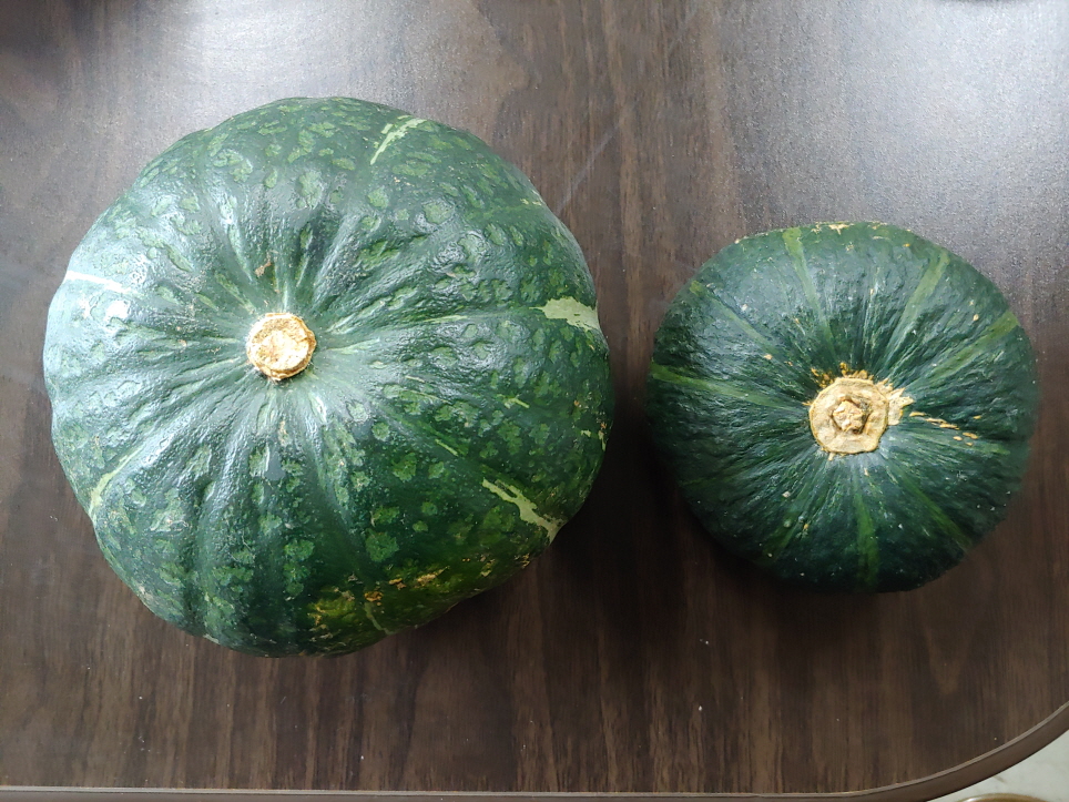 마트에서 산 단호박은 사이즈가 무척 크다. 자로 재보니 직경이 150미리가량 된다. 이에 반하여 밤호박은 상대적으로 크기가 작다. 직경이 100-110미리 가량된다.