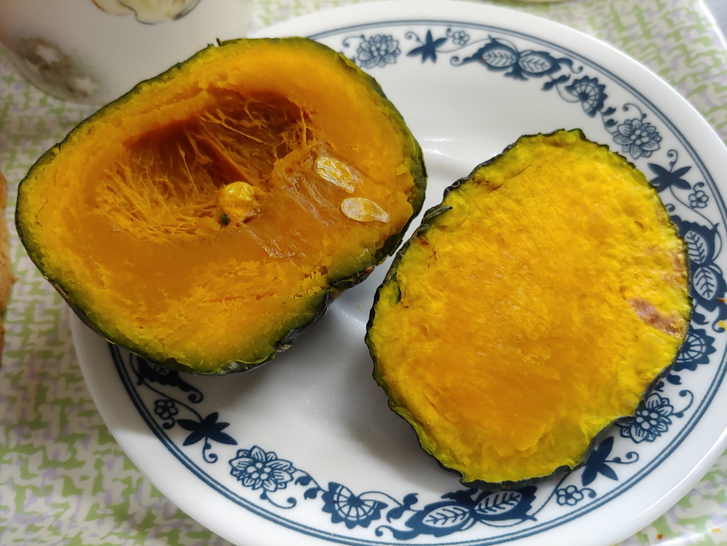 단호박도 밤호박 맛이 날까? 단호박의 일부를 잘라서 전자레인지에 4분 돌렸다. 충분히 익은 것 같다. 밤호박과 단호박을 한 그릇에 놓고서 번갈아 먹어 봤다.
