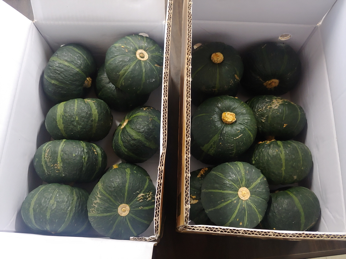 해남 황토농장에서 재배된 밤호박 두박스가 택배로 도착했다. 한박스에 9-10개 들어 있다. 한박스에 4키로 기준이다. 가격은 택배비 포함하여 3만원이다.