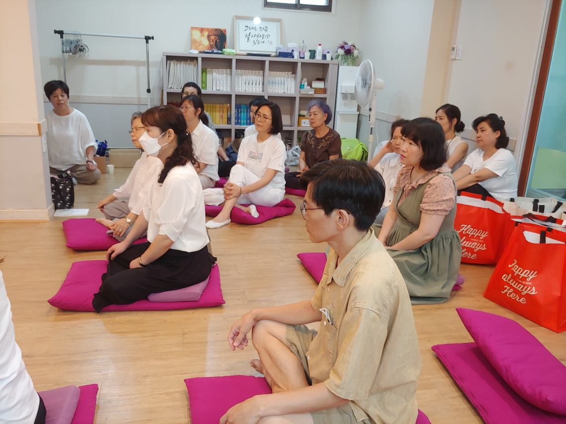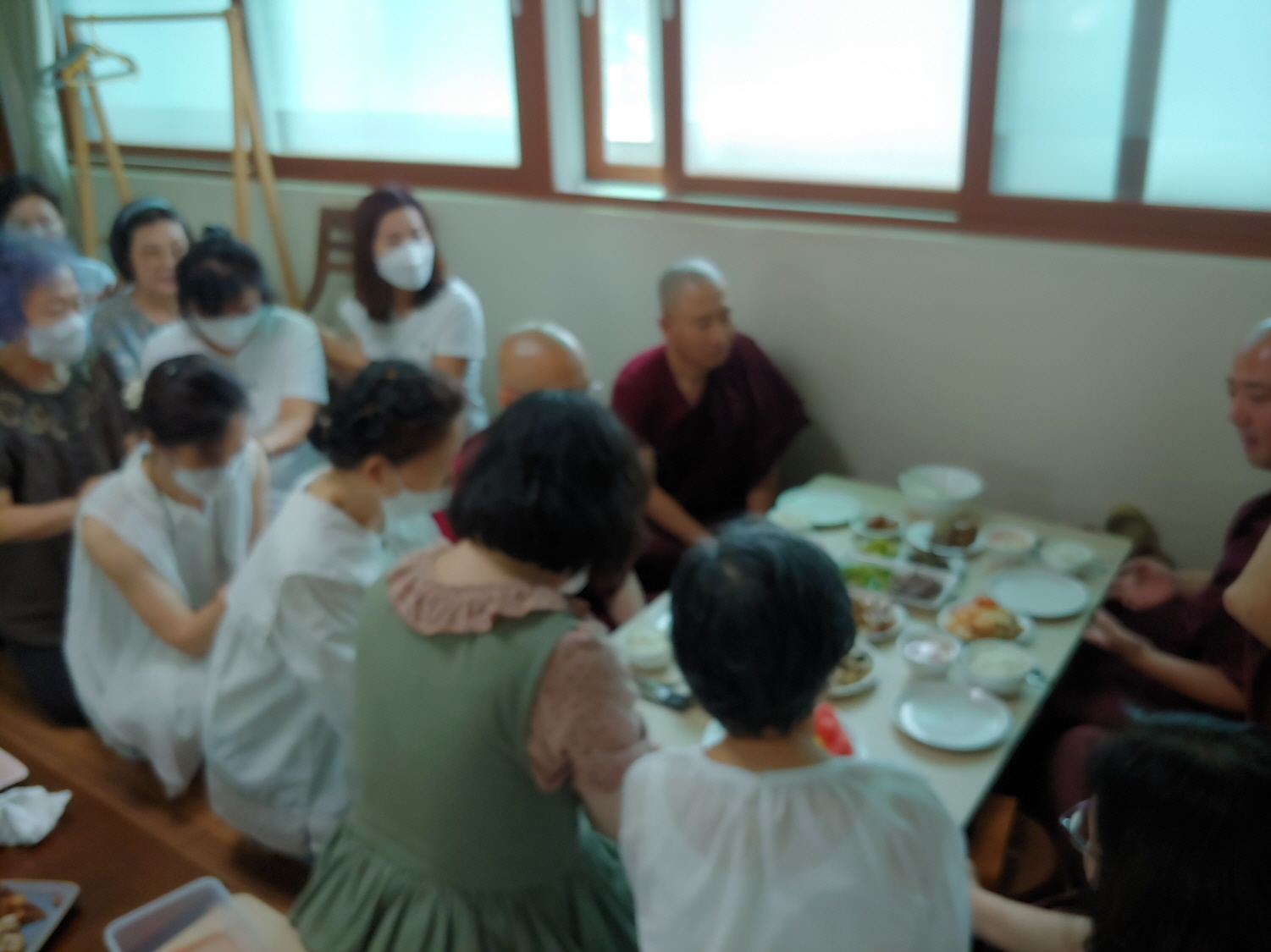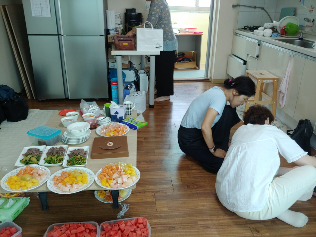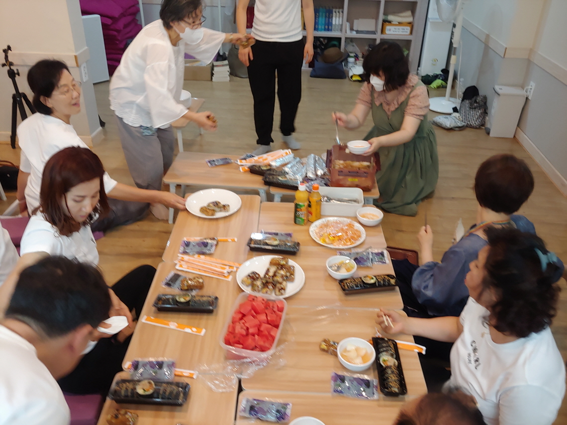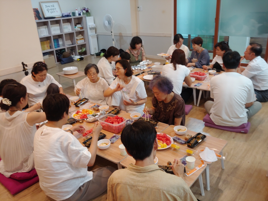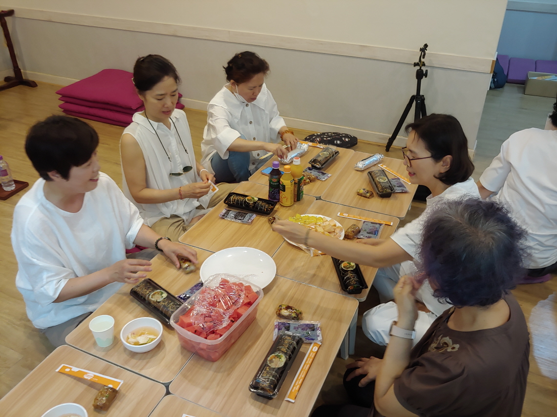 2층 법당은 식당이 되었다. 책상이 필요에 따라 밥상이 되듯이, 법당도 필요에 따라 법당이 되는 것이다. 음식은 김밥이 제공되었다. 그리고 떡과 과일이 나왔다.