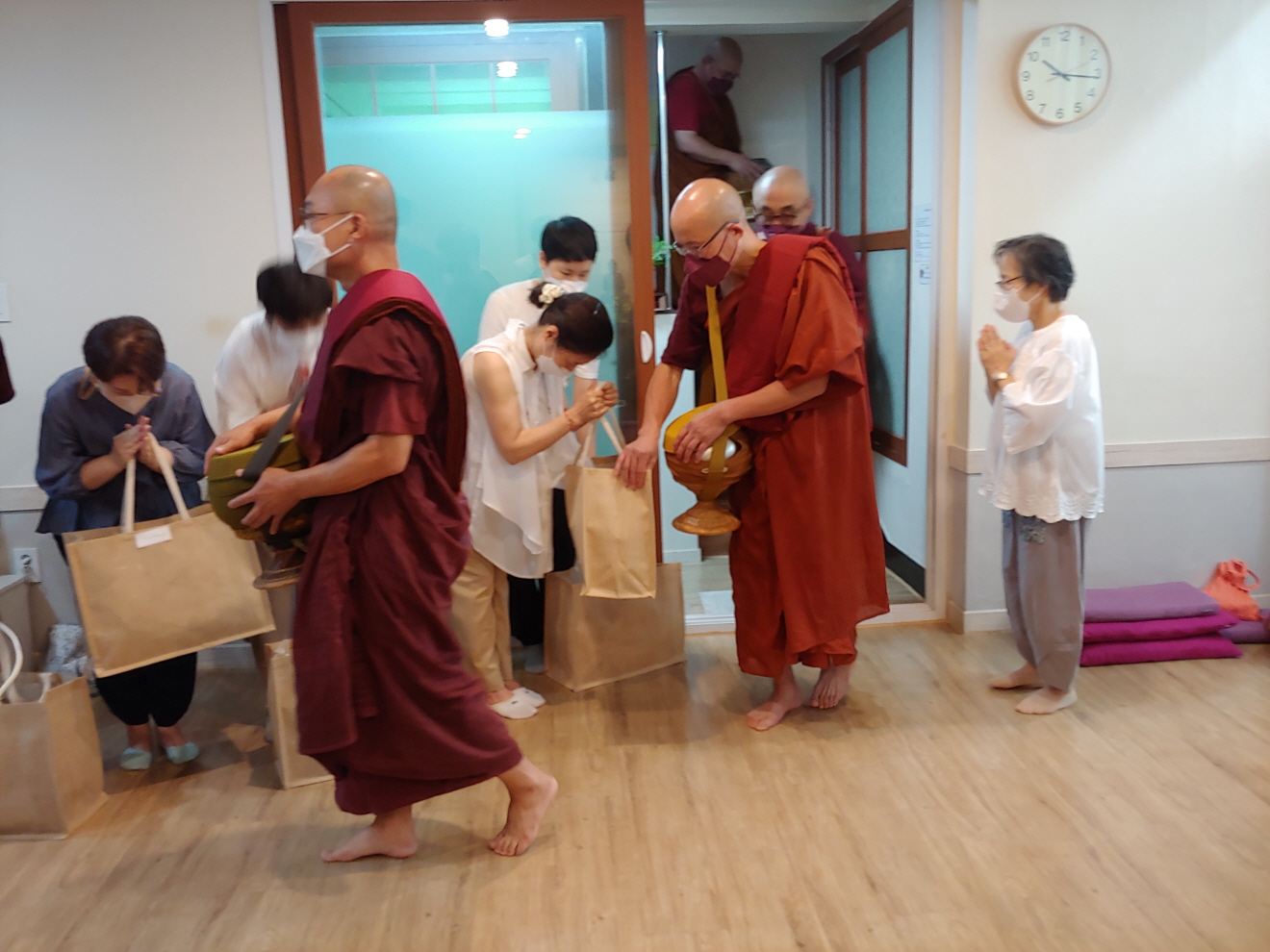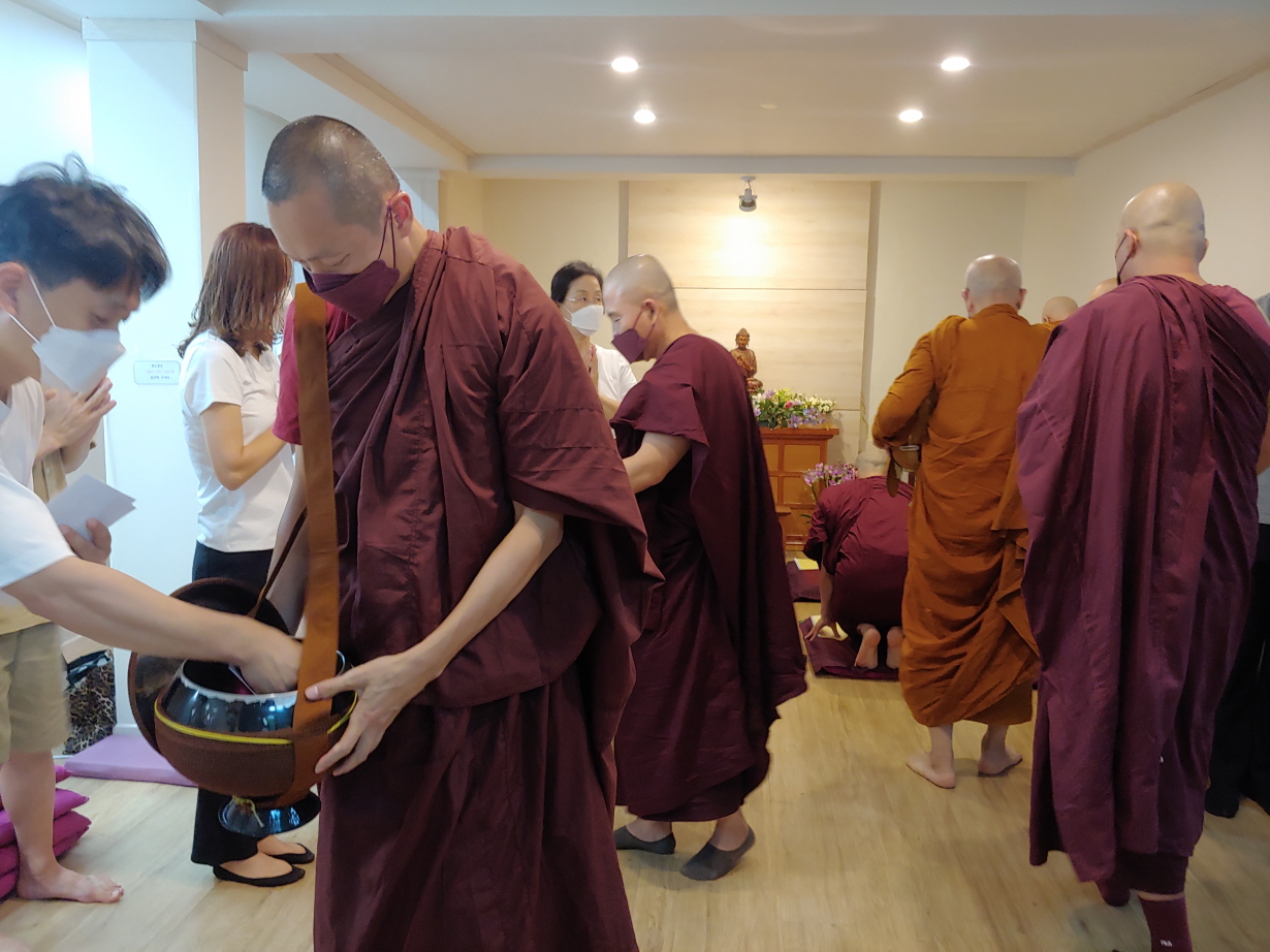 테라와다불교의 가장 큰 특징이 있다. 그것은 탁발이다. 탁발 없는 테라와다불교를 상상할 수 있을까? 담마와나선원에서도 탁발이 있다. 실내에서 하는 탁발이다. 사람들이 줄을 서서 보시할 것을 들고 있다.