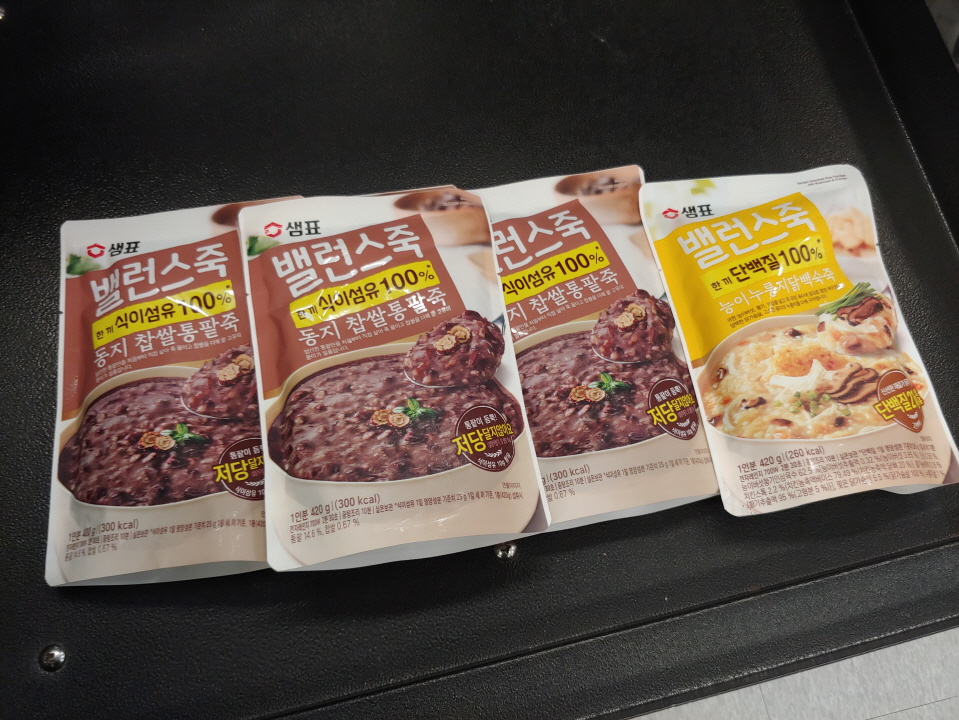 예상은 맞아 떨어졌다. 팥죽을 팔고 있었다. 봉지에 담겨 있는 것이다. 일인분에 420그램이다. 네 봉지에 9,900원이다. 한봉지에 2500원 꼴이다. 더구나 보너스로 누룽지닭백숙죽을 하나 더 준다. 이를 4플러스1이라고 해야 할까?