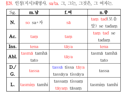 빠알리어 12주는 표만 남았다. 앞으로 강독을 하면 표를 활용할 것이라고 한다. 이렇게 본다면 명사격변화 1번표와 인칭대명사 28번표, 그리고 동사활용변화표는 마치 사진 찍듯이 새기고 있어야 한다.