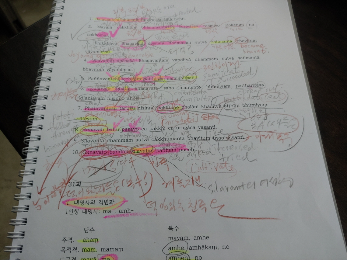 현재 가지고 있는 빠알리 교재는 너덜너덜해졌다. 예습하는 과정에서 낙서해 놓았기 때문이다. 연필과 형광메모리펜과 볼펜이 동원되었다. 메모하고 칠 하다 보니 온통 낙서투성이가 되었다. 그러나 이것은 훈장과도 같은 것이다. 또한 배움에 대한 몸부림과도 같은 것이다.