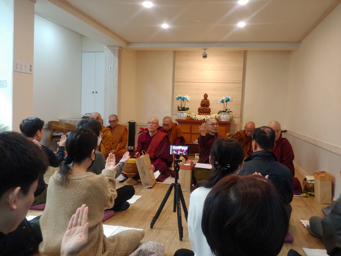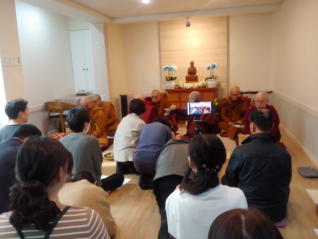 법당에 사람들이 모였다. 불단 쪽에는 여섯 명의 상가스님들이 앉아 있다. 법당에는 남녀재가불자들이 약 서른 명 가량 모였다.