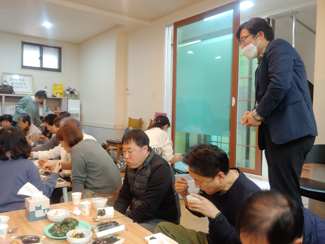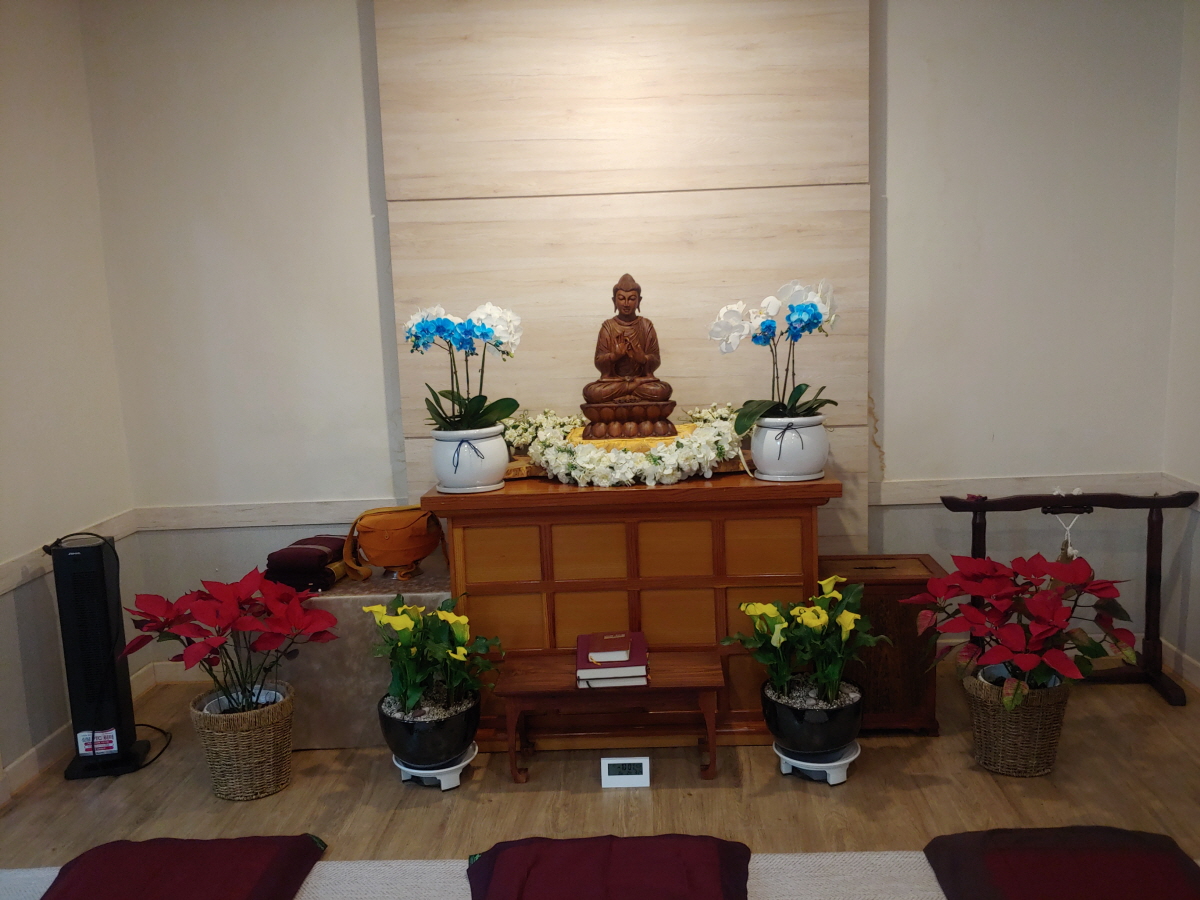법당에 자리를 마련했다. 절에 가면 비빔밥이 제공되지만 작은 사원에서는 비빔밥을 제공할 여력이 되지 않는다. 그래서 주로 김밥과 떡이 제공된다.