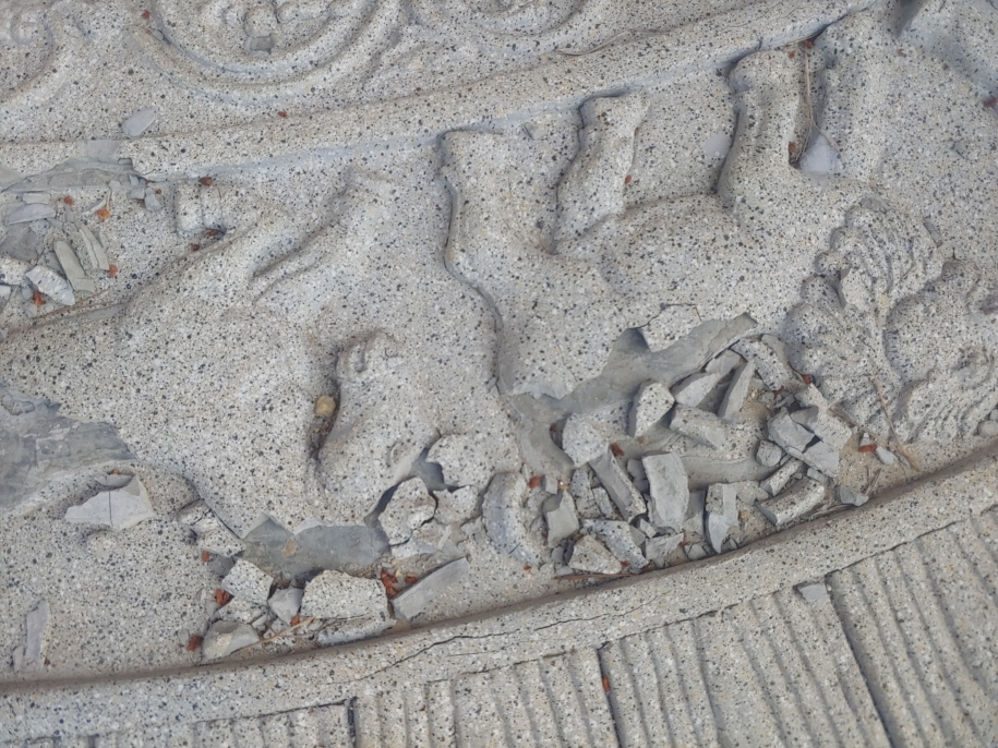 마하위하라 법당 입구에 문스톤을 보았다. 참으로 놀라웠다. 성지순례 때 보던 것이 여기에도 있는 것이다. 그런데 자세히 보니 시멘트로 만들었다. 그래서인지 파손된 부위가 많다. 대책을 세워야 한다. 담마끼띠 스님은 “석판으로 된 문스톤으로 대체할 예정입니다.”라고 말했다.