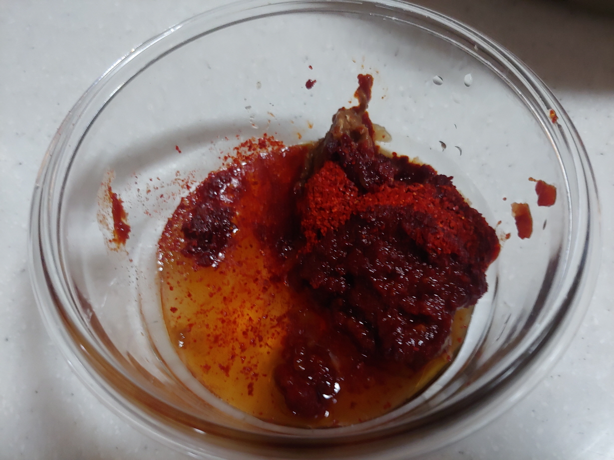 무침은 손맛이라고 한다. 비닐장갑을 끼고 버무렸다. 양념은 생각해서 만든 것이다. 된장, 고추장, 고추가루, 다진마늘, 간장, 들기름, 식초, 올리고당, 설탕 등 집에 있는 양념을 총동원 했다. 그야말로 갖은 양념으로 버무린 것이다.