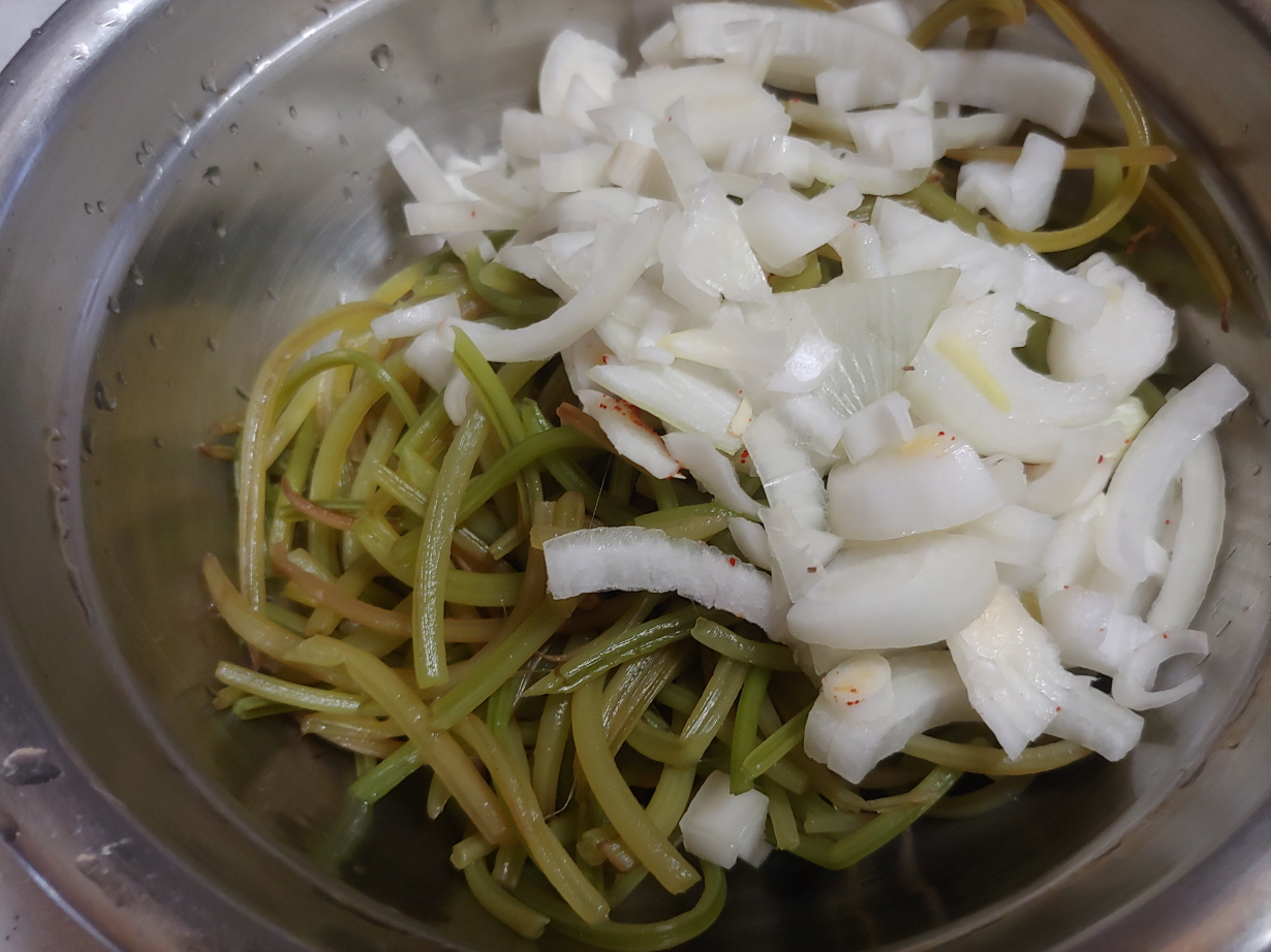 무침 만들기는 어렵지 않다. 유튜브를 보면 거기서 거기이다. 줄기를 끓는 물에 5분가량 데친다. 찬물에 행구어서 차게 만든다. 그리고 준비된 양념을 버무려서 만들면 된다.