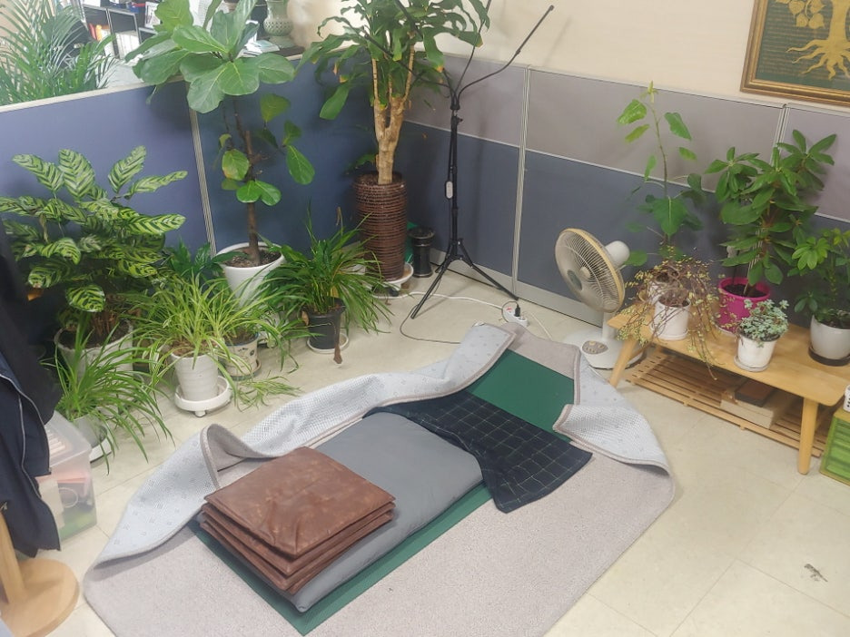 창측에 실외기를 설치해야 한다. 그렇게 하기 위해서는 자리를 비켜 주어야 한다. 탁자와 화분을 명상공간으로 옮겼다. 마치 사무실이 피난민촌이 된 것처럼 어수선하다. 이런 가운데 자리에 앉았다.