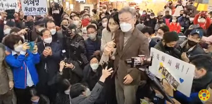 누가 영부인 될 것인지 물으면 이재명 열기가 대단하다. 오늘 점심때 유튜브로 청주시장 방문을 보았다. 재래시장 중앙통로를 가득매운 사람들이 "이재명"과 "대통령"을 연호했다. 최근 유튜브에서 이재명의 매타버스 행보를 주목하고 있다. 이른바 버스로 민생투어를 하고 있는 것이다. 가는 곳마다 사람들이 몰린다. 어떤 이들은 이에 대하여 동원했다고 말한다. 물론 없지 않아 있을 수도 있을 것이다. 그러나 분위기로 알 수 있다. 자발적 참여자와 유튜버들, 그리고 현장에 있는 사람들의 참여가 만들어 낸 것이다. 그 절정이 오늘 점심때 청주시장이 아닌가 생각된다. 유튜브에 이런 썸네일을 보았다. "이재명은 지지자들이 따라 다니고, 윤석열은 기레기들이 따라 다닌다."라고. 그러고 보면 포털 뉴스에는 온통 윤석열 이야기..